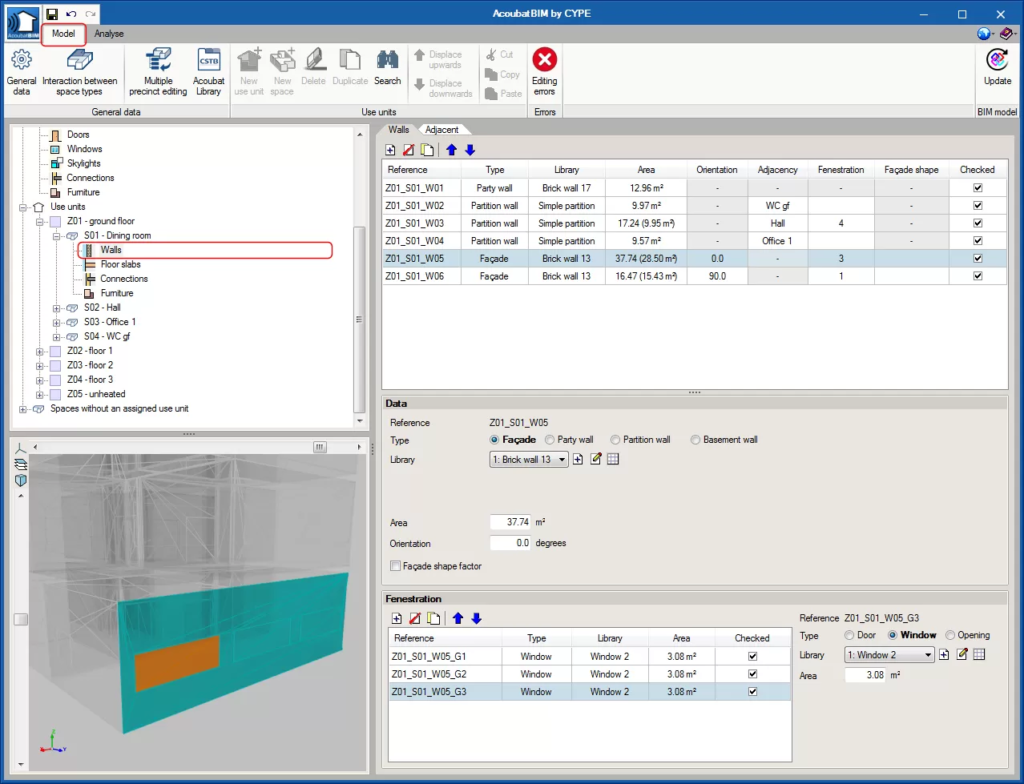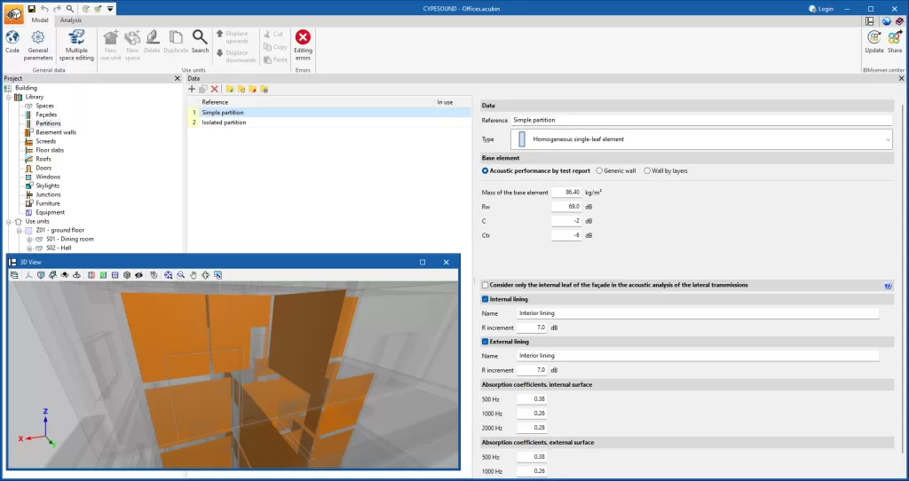 Sol tarafta, proje tanımlama için kullanılan ana araçlar, örneğin tip kütüphaneleri bulunur. Bunlar, daha sonra binanın her bir bileşenine uygulanacak olan akustik karakterizasyonları da dahil olmak üzere her türlü elemanı tanımlar.