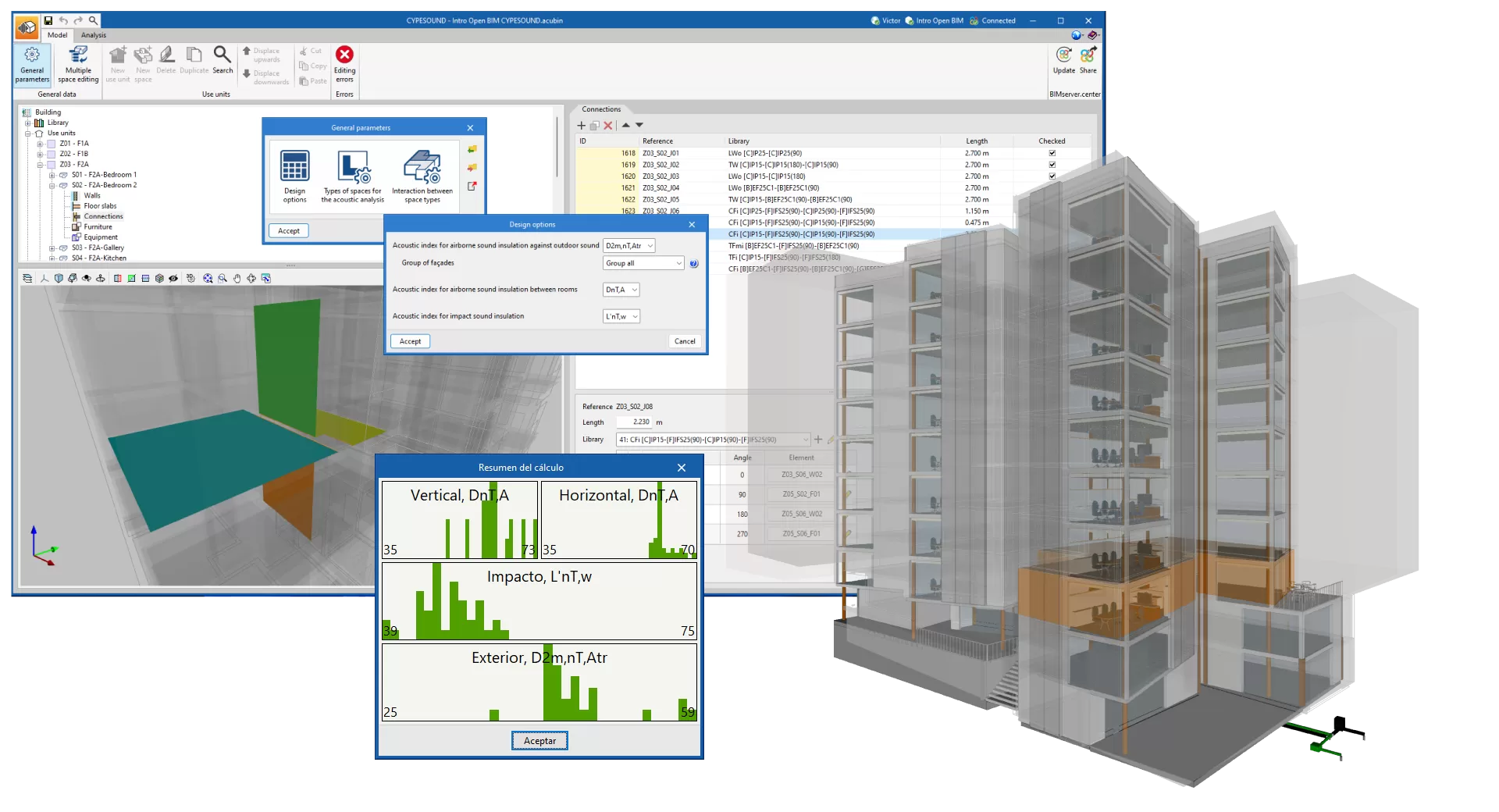 CYPESOUND, farklı ülkelerin yönetmeliklerine veya özelleştirilmiş parametrelere ve EN 12354’te (ISO 15712) açıklanan hesaplama yöntemine dayanarak, bir binanın ses yalıtım ve ses emilim seviyesini tasarlamak ve doğrulamak için kullanılan bir programdır.